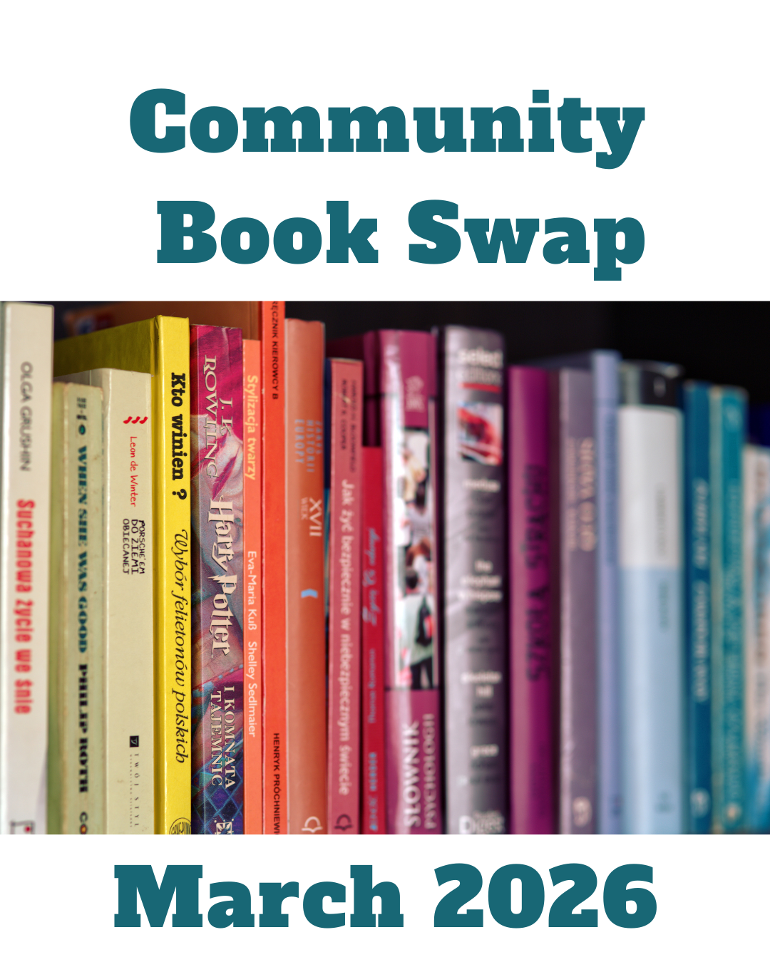 We are still in the planning stages for this event. Start reading from your stash and setting aside books you’re ready to part with and share with your community. And. check back for more details for this March Swap!